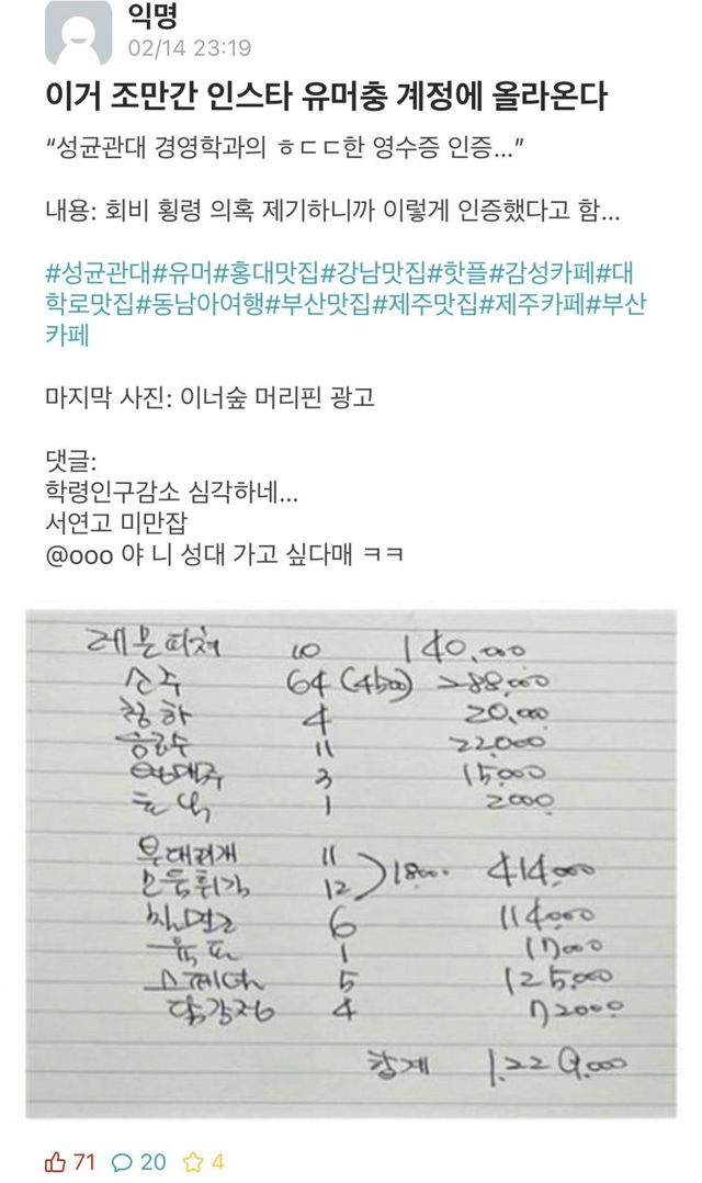 사유는 사장님이 수기작성하시기 때문이라는데 학생들 반응은 현금영수증 요청하면 해주신다고 함 띠용?