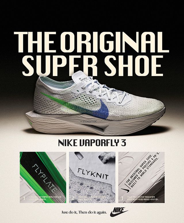 나이키는 오늘날의 ‘슈퍼슈즈’ 시장을 연 주인공이다. 사진 속 보이는 베이퍼플라이 3는 2019년 엘리우드 킵초게가 ‘마의 2시간 벽’을 깰 때 신었던 러닝화의 후계자다. 화려한 명성만큼 디자인과 기술력 역시 화려한 신발이다. 국내 가격은 29만9000원이다.