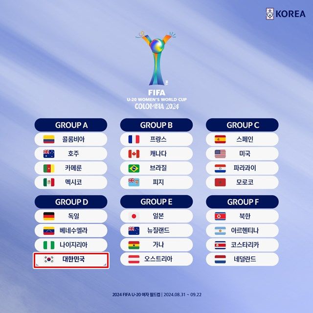 오는 9월 콜롬비아에서 열리는 2024 FIFA U-20 여자 월드컵 조 편성./KFA