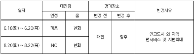 한국야구위원회(KBO)는 6일 "대전에서 개최 예정이었던 18~20일 키움 히어로즈와 한화 경기, 8월 20~22일 NC 다이노스와 한화 경기가 열리는 장소가 청주로 변경됐다"고 밝혔다.