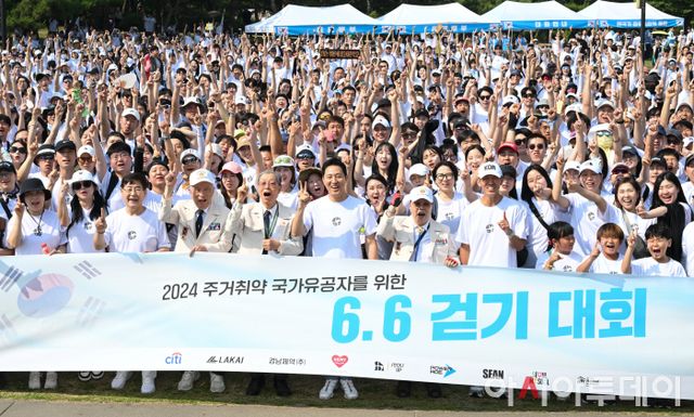 현충일인 6일 오전 서울 중구 남산공원 백범광장에서 열린 2024 주거취약 국가유공자를 위한 '6.6 걷기 대회'에서 오세훈 서울시장과 6.25 참전용사, 시민들이 출발에 앞서 기념촬영을 하고 있다. /정재훈 기자