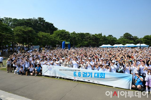 현충일인 6일 오전 서울 중구 남산공원 백범광장에서 열린 2024 주거취약 국가유공자를 위한 '6.6 걷기 대회'에서 오세훈 서울시장과 6.25 참전용사, 시민들이 출발에 앞서 기념촬영을 하고 있다. /정재훈 기자