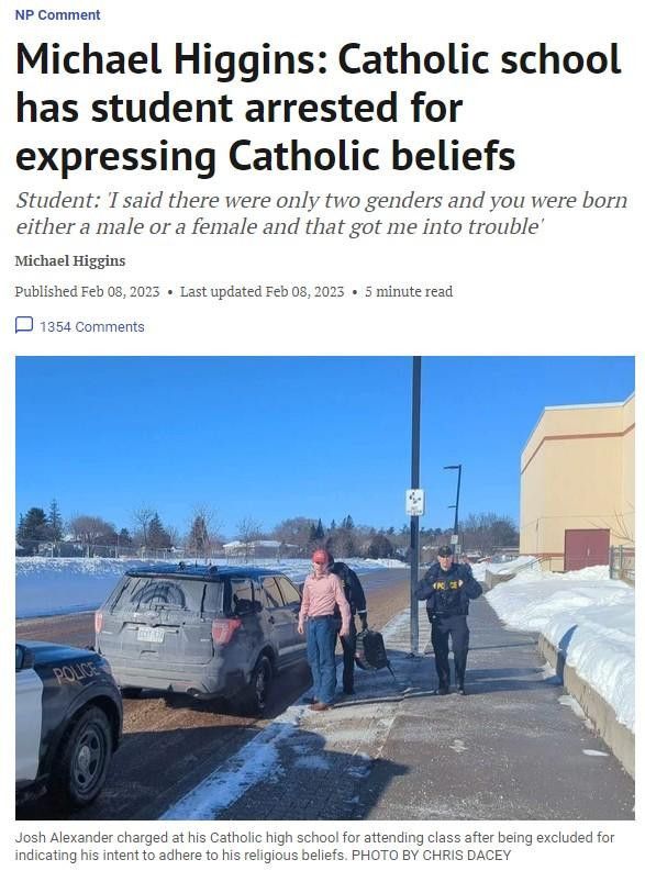 가톨릭 학교 수업 토론에서 “성별은 두가지뿐이다” 라고 말한 학생이 정학 처분을 당함