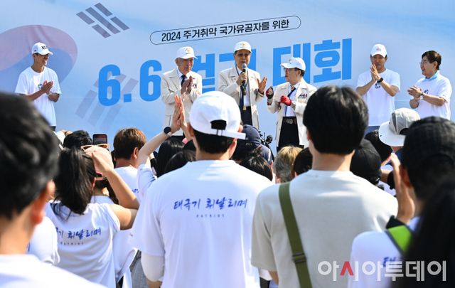현충일인 6일 오전 서울 중구 남산공원 백범광장에서 열린 2024 주거취약 국가유공자를 위한 '6.6 걷기 대회'에서 6.25 참전용사들이 무대에 올라 인사말을 하고 있다. 왼쪽부터 조해원 6.25참전자회 송파지구회 감사, 최은석 6.25참전자회 송파구지회장, 권중섭 6.25참전자회 송파지구회 감사. /정재훈 기자