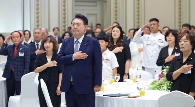 윤 대통령은 6일 현충일 추념식 후 서울 종로구 청와대 영빈관에서 국가유공자·보훈가족과 점심을 함께 했다. 오찬엔 6·25 전쟁 학도병과 제2연평해전·연평도 포격전 참전용사, 천안함 피격사건 유족, 순직 군인·경찰·소방공무원 유족 등 160여 명이 참석했다.