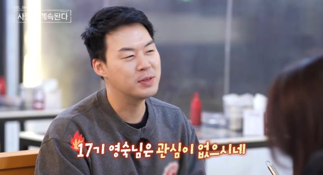 6기 영수가 과거 ‘나는 SOLO’ 6기 때 선보였던 장기자랑에 대한 이야기가 나오자, 이에 대해 잘 모르는 17기 영숙을 향해 “저한테 관심이 없으시네요. 15기 현숙님은 다 기억해 주시는데”라고 ‘비교 모드’를 가동했다.