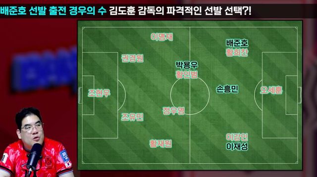 한준에 따르면 공격진에서는 손흥민-황희찬-이강인으로 구성될 가능성도 크다. 여기에 배준호가 합류할 수 있다. 김도훈 감독이 공격적이고 역동적인 축구를 펼치겠다는 의지를 밝힌 만큼, 이들 공격수들의 활약이 기대되는 부분이다.