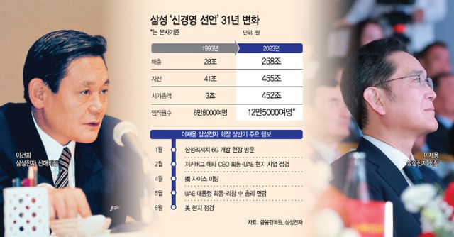6일 재계에 따르면 프랑크푸르트 선언 당시 연간 매출 28조원, 자산 41조원에 그쳤던 삼성전자의 규모는 지난해 기준 연간 매출 258조원, 자산 455조원으로 10배가량 불어났다. 시가총액도 3조원에서 452조원으로 증가했다. 다만 삼성은 지난해와 마찬가지로 이를 기념하는 별도의 행사는 열지 않을 것으로 알려졌다.