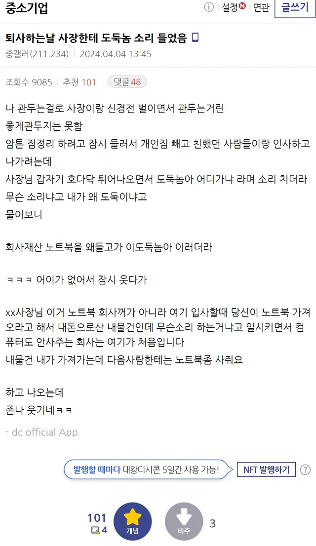 퇴사하는날 사장한테 도둑놈 소리 들었음 도둑놈아 어딜가느냐!!!
