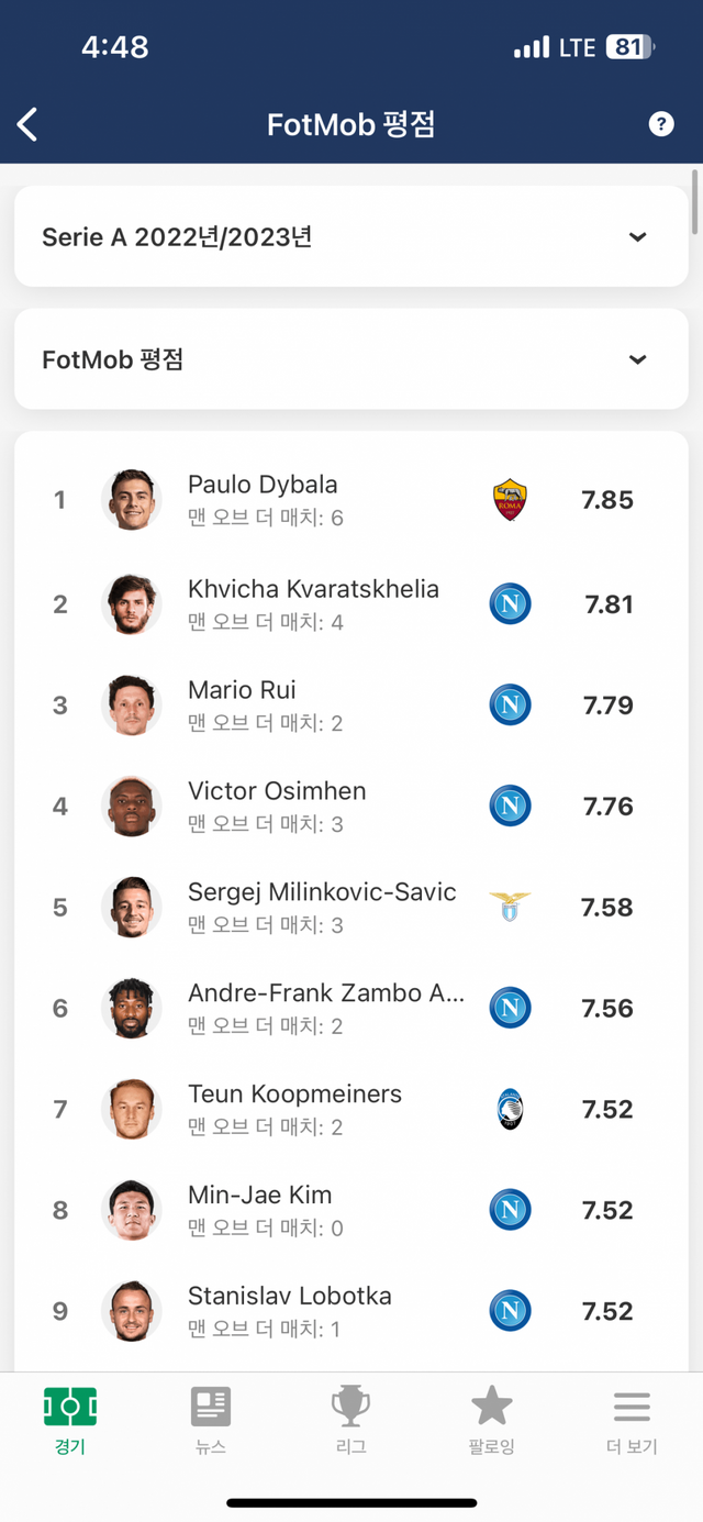 센터백 중 1위 (수비수는 평점이 좀 짠데 그럼에도 전체 8위)