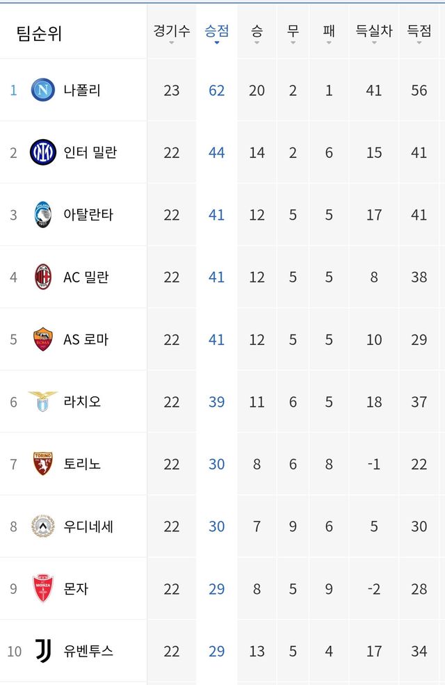 (유벤투스는 분식회계 걸려서 승점 깎임)