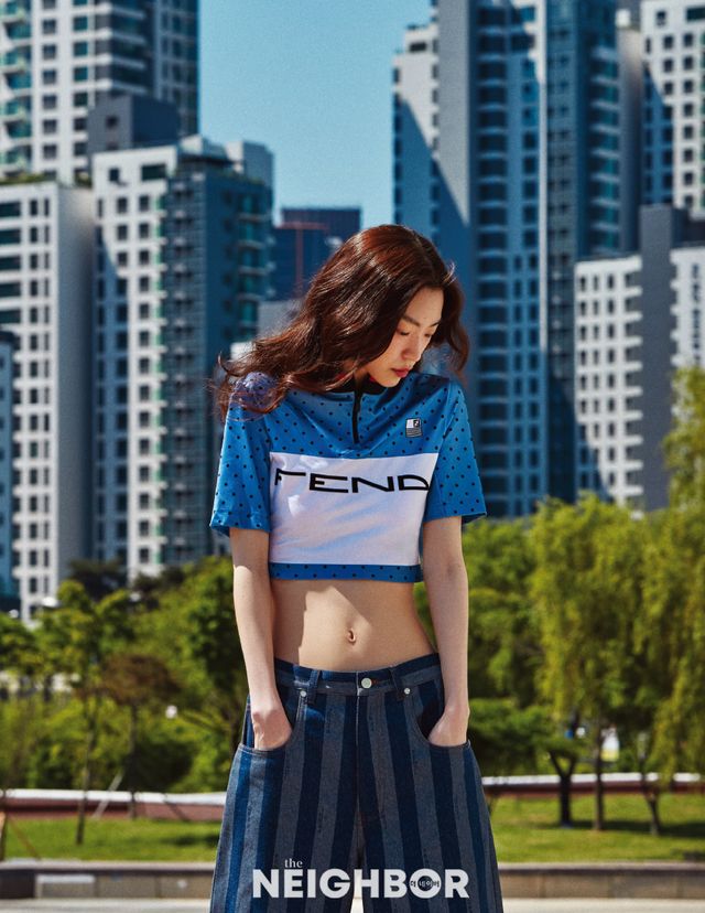 Fendi 저지 소재 쇼트 슬리브 크롭트 톱 90만원대, 스트라이프 패턴 데님 팬츠 100만원대.