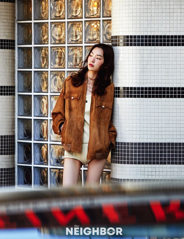 Miu Miu 빈티지한 무드의 스웨이드 가죽 재킷, 리브드 탱크톱, 브리프 모두 가격 미정.