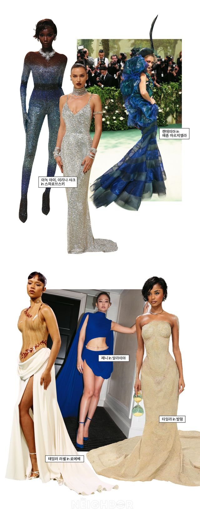 지난 5월 6일, 지상 최대의 패션 이벤트 메트 갈라가 열렸다. 올해 메트로폴리탄 박물관의 패션 전시 테마는 ‘Sleeping Beauties: Reawakening Fashion’. 메트 갈라 주최측은 전시 테마에 맞춰 ‘The Garden of Time(시간의 정원)’을 드레스 코드로 제시했다. 2024년 메트 갈라의 공동 호스트 배우 젠데이아는 디올의 1999년 빈티지 드레스와 지방시의 1996년 아카이브 드레스, 두 벌을 선보여 가장 많은 플래시 세례를 받았다. 배우 테일러 러셀은 트롱프뢰유 기법을 사용해 나무 질감을 표현한 로에베의 보디스로 독보적인 세련미를 뽐냈다. 블랙핑크의 제니는 ‘알라이아’와 손잡아 화제를 모았다. 원단 하나로 드레스 전체를 만든 쿠튀르 드레스는 압도적인 아름다움으로 빛났다. 가수 타일라는 진짜 ‘모래’와 마이크로 크리스털을 사용한 일명 ‘모래시계 드레스’를 입었는데, 레드카펫 이후 크리에이티브 디렉터 올리비에 루스테잉이 드레스를 커팅하는 비하인드 영상으로 또 한 번 화제가 됐다. 톱모델 아녹 야이와 이리나 샤크는 온몸에 보석을 두르고 등장했다. 바로 스와로브스키의 쿠튀르 의상을 입은 것. 이리나 샤크는 ‘공기’를 표현한 8만4000개의 크리스털로 장식한 드레스를 착용했고, 아녹 야이는 ‘물’을 의미하는 크리스털 보디슈트로 시선을 앗았다.
