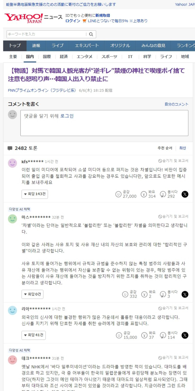 대마도 와타즈미 신사에서 무단 흡연한 한국인이 이를 지적하는 신사 관계자에게 오히려 화를 내며 폭행하고 도망쳤다는 뉴스
