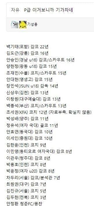 최소 3년이상 지도자 경력이 지원 요건이였으나 완화해서 합격했다는 특혜 논란이 있엇음
