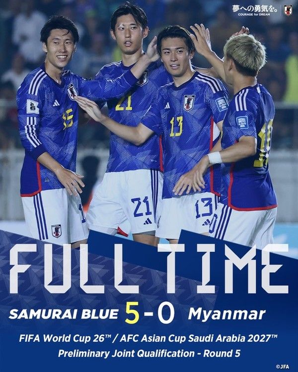 6일(한국시간) 미얀마 양곤에 위치한 투운나 스타디움에서 2026 북중미 월드컵 아시아 2차 예선 B조 5차전을 치른 일본이 미얀마에 5-0 대승을 거뒀다. 승점 3점을 추가한 일본은 마지막 6차전 결과와 무관하게 조 1위를 확정했다. 경기 종료 시점 아직 5차전을 마치지 않은 2위 시리아와 승점 격차를 8점으로 벌렸다.