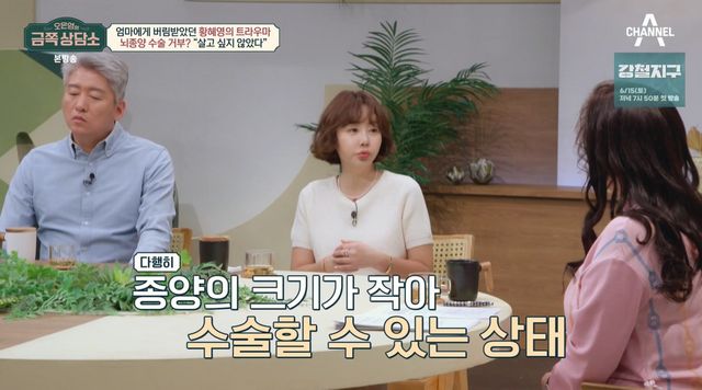 황혜영은 “결혼 바로 직전에 뇌종양 판정을 받았다. 다행히 크기가 작아 수술할 수 있는 상태였다”며 “(그런데) 수술 날짜를 안 잡고, 그냥 살고 싶지 않았기 때문”이라고 고백했다.