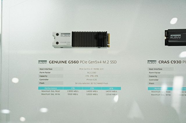 KLEVV GENUINE G560은 가장 많은 소비자들이 주목하고 있는 신제품입니다. PCIe Gen5 기반의 고성능 SSD인 점 외에 팬시하고 예쁜 히트싱크를 장착한 덕분에 튜닝용 SSD로도 인기가 높을 것으로 기대하고 있습니다. 쿨링팬 없이도 Gen5 기반 SSD의 높은 발열을 완벽하게 해소하기 위한 높은 히트싱크에 에센코어의 디자인 철학을 담아낸 제품입니다. 최대 13000MB/s 읽기와 9500MB/s 쓰기의 막강한 성능을 갖추었는데요, 컴퓨텍스 행사 종료 직후 출시할 예정입니다.