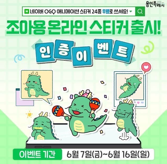 [와이뉴스] 용인특례시는 네이버 소통 공간인 블로그나 카페 등에서 글을 쓸 때 사용할 수 있는 ‘조아용’ 애니메이션 스티커 24종을 7일부터 무료 제공한다고 밝혔다.