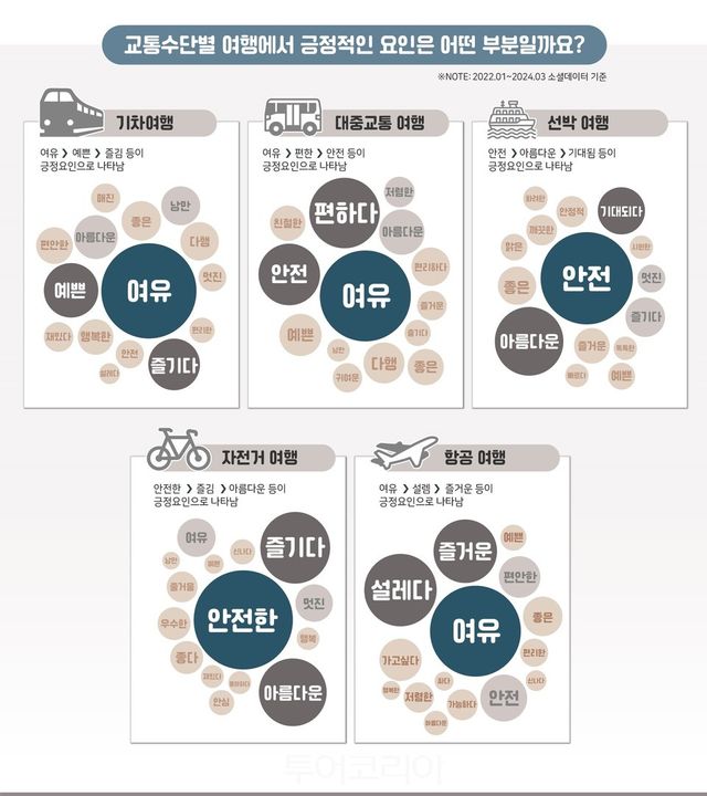 기차여행은 ‘낭만’, 대중교통여행은 ‘편한’, 선박여행은 ‘기대됨’ 항공여행은 ‘설렘’이 다른 교통수단과 차별화된 긍정 요인으로 꼽혔다. 반면, 교통수단별 여행에 대한 부정적인 인식은 기차여행은 이동 시간과 비용, 대중교통은 혼잡함, 선박ㆍ자전거ㆍ항공여행은 안전에 대한 우려 등이 언급됐다.