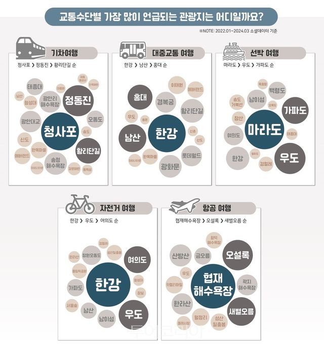 선박을 이용한 여행에서는 마라도, 우도, 가파도 순으로 언급량이 많았으며 자전거여행과 관련된 관광지는 한강, 우도, 여의도 순으로 조사되었다. 항공여행에서는 제주도 협재해수욕장, 오설록, 새별오름, 산방산 등이 주목을 받았다.