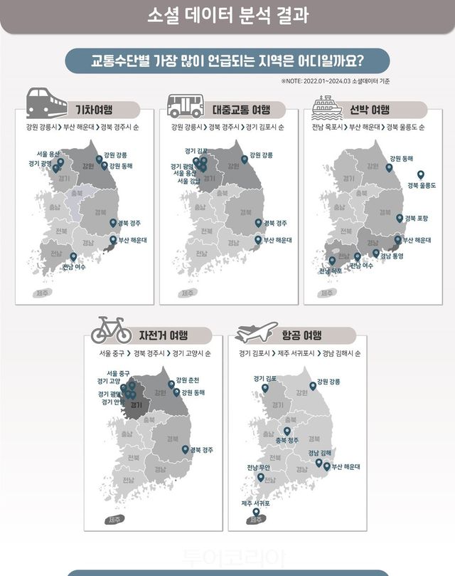 교통수단별 가장 많이 언급되는 지역은 ▲기차여행은 강원도 강릉시, 부산광역시 해운대구, 경상북도 경주시 ▲대중교통여행은 강원도 강릉시, 경상북도 경주시, 경기도 김포시 ▲선박여행은 전라남도 목포시, 부산 해운대구, 경상북도 울릉군, ▲자전거여행은 서울특별시 중구, 경상북도 경주시, 경기도 고양시 ▲항공여행은 경기도 김포시, 제주특별자치도 서귀포시, 경상남도 김해시로 나타나며 교통수단마다 언급되는 지역이 달라지는 것을 확인할 수 있었다.