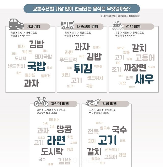 교통수단별 가장 많이 언급되는 음식은 기차여행은 국밥, 김밥, 과자 등이었다. 또 대중교통은 튀김, 김밥, 과자였으며, 자전거여행은 라면, 도시락, 항공여행은 고기, 국수, 갈치, 선박여행은, 새우, 짜장면 등이었다.