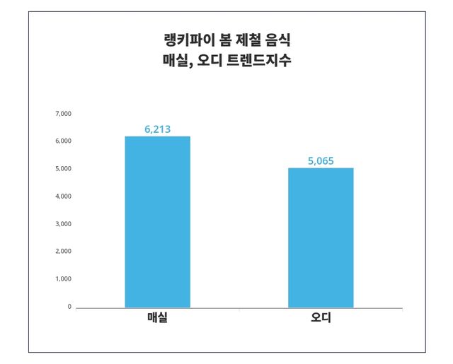 랭키파이의 분석에 따르면, 매실이 봄 제철 음식 트렌드지수에서 '6,213포인트'로 1위를 차지했다. 이어 오디가 '5,065포인트'로 2위를 기록했다. 두 트렌드 사이의 지수 차는 '1,148포인트'로 나타났다.
