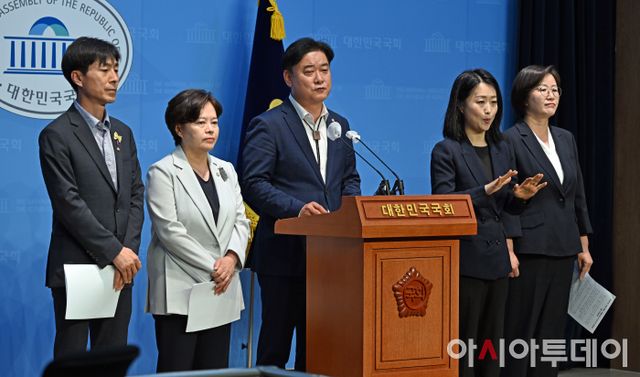 아시아투데이 송의주 기자 = 야 4당 초선의원들이 7일 국회 소통관에서 공동 기자회견을 열고 22대 국회 원 구성을 촉구하고 있다. 왼쪽부터 사회민주당 한창민·조국혁신당 정춘생·더불어민주당 윤종군 의원, 수화 통역사, 진보당 정혜경 의원.