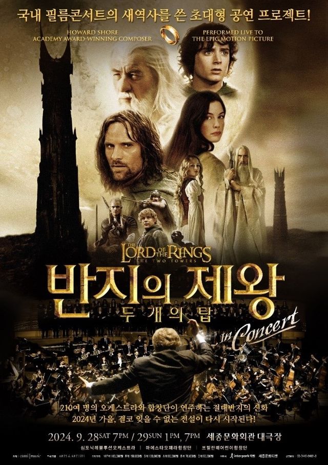 트릴로지 영화 ‘반지의 제왕’의 제2편에 해당하는 ‘반지의 제왕: 두 개의 탑’의 필름콘서트가 오는 2024년 9월 28일과 29일 양일에 걸쳐 서울의 ‘세종문화회관 대극장’에서 공연된다. 총 누적 아카데미상 17개 부문 수상을 자랑하는 최고의 명작으로 사랑받으며, 내용과 영상은 물론 음악적으로도 독보적인 사랑을 받고 있는 ‘반지의 제왕: 두 개의 탑’은 세종문화회관 대극장의 초대형 스크린에서 상영되는 영화와 함께, 풀편성 오케스트라와 대규모 합창단이 펼치는 라이브 연주를 동시에 감상하는 ‘필름 콘서트’ 형태로 공연되며, 영화를 사랑하고 음악을 사랑하는 수많은 팬들에게 잊지못할 놀라운 경험을 안길 예정이다.