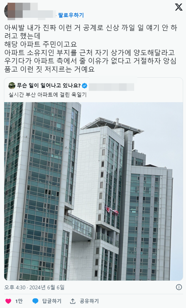 현충일에 욱일기를 내걸었던 부산의 아파트 주민이 계속해서 화제가 되고 있다.