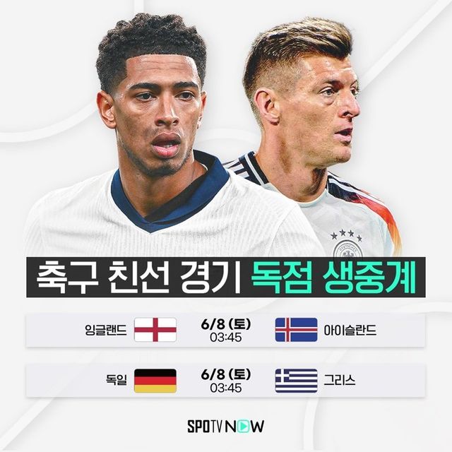 오는 8일 새벽 3시 45분에 킥오프되는 축구 친선경기 잉글랜드 대 아이슬란드 경기는 스포티비 프라임(SPOTV Prime), 독일 대 그리스 경기는 스포티비 프라임2(SPOTV Prime2)에서 시청 가능하다. 두 팀의 경기는 스포티비 나우(SPOTV NOW)에서 동시 생중계된다.