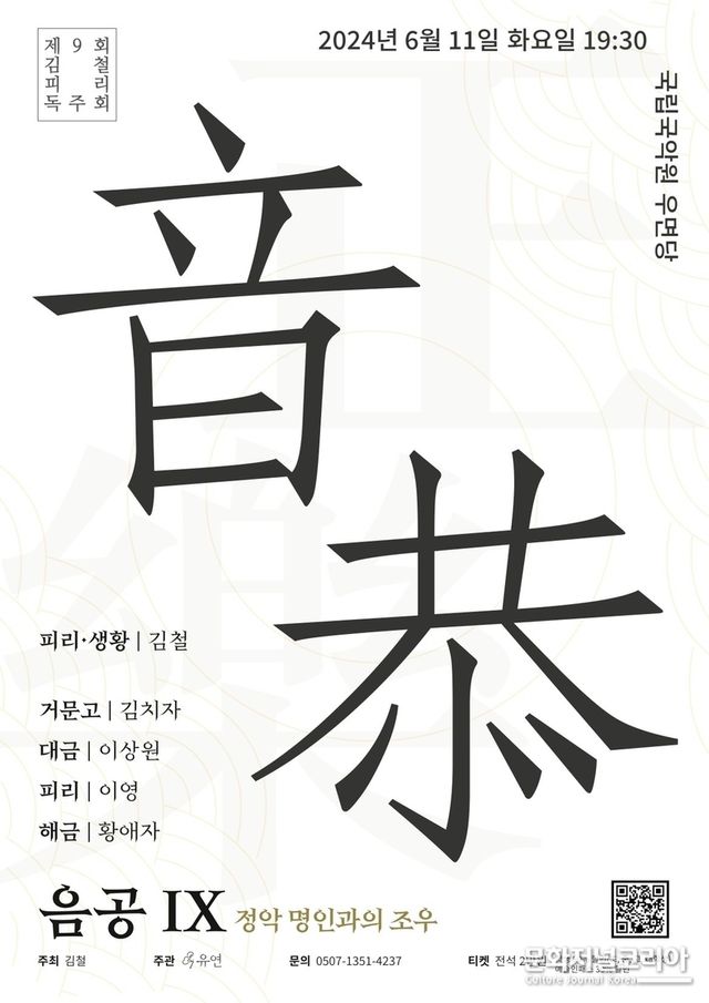 문화저널코리아 정종균 기자 | 국립국악원 정악단의 피리 연주자 김철이 오는 6월 11일 (화) 오후 7시 30분, 국립국악원 우면당에서 제9회 김철 피리독주회 <음공 (音恭) IX> 무대를 선보인다.