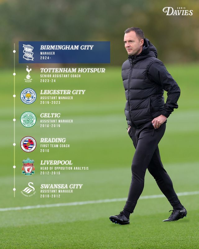 버밍엄은 7일(한국시간) 공식 홈페이지를 통해 "버밍엄 시티는 크리스 데이비스를 1군 팀 감독으로 임명했다"며 "데이비스는 4년 계약을 체결했으며 양측이 보상에 합의한 후 토트넘 홋스퍼로부터 즉시 클럽에 합류했다"고 데이비스 감독의 선임을 발표했다.