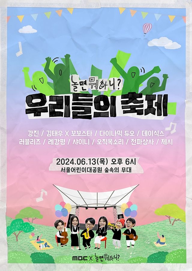 여기에 '놀면 뭐하니?'와 깊은 인연이 있는, 영케이가 소속된 밴드 '축제 섭외 0순위' 데이식스가 합류해 축제의 열기를 더했다. 힙합신을 대표하는 다이나믹 듀오와 제시, 전국민 떼창곡 '땡벌'을 보유한 트로트 스타 강진, 지오디 김태우와 꼬꼬스타 드러머 사장님의 컬래버, 레게 그룹 레강평(스컬X하하), 축제계 뉴페이스 밴드 전파상사, 아카펠라 그룹 오직목소리 등 다양한 장르를 아우르는 라인업이 공개돼 풍성한 무대를 예고했다.
