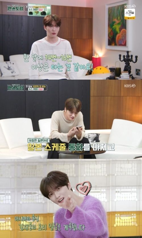 최근까지도 일본에서 예능, 드라마 공연 등 활발한 활동 중인 김재중은 “비행기를 많이 탈 때는 한 달에 14번~16번 이상은 타는 것 같다”고 밝혔다.