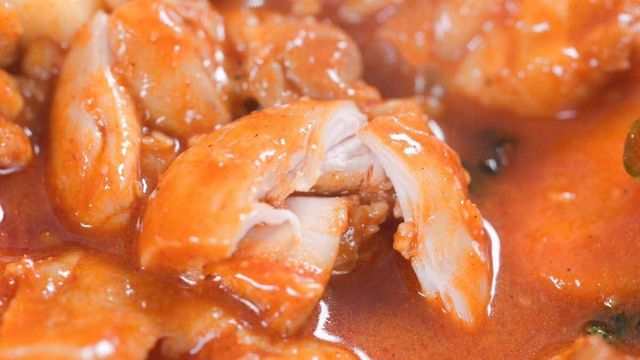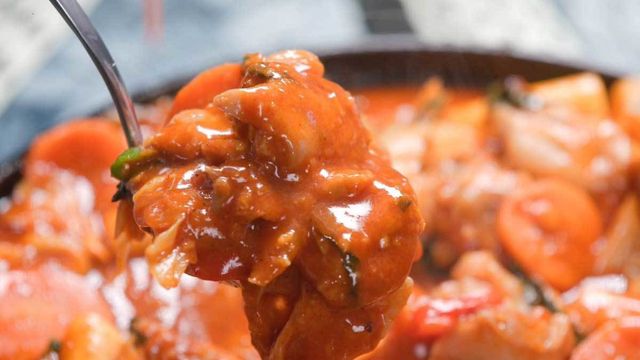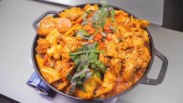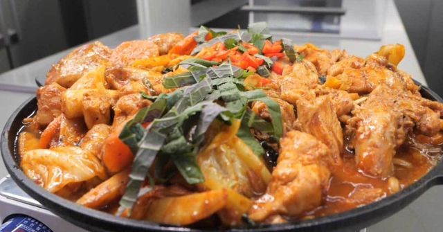 웍에 염지 된 닭을 넣고 볶다가 양배추를 넣어 함께 볶는다. 양배추의 수분감을 이용해 고기가 타지 않게 익혀준다. 그다음 대파, 고구마, 당근, 양념장을 넣고 함께 볶는다.