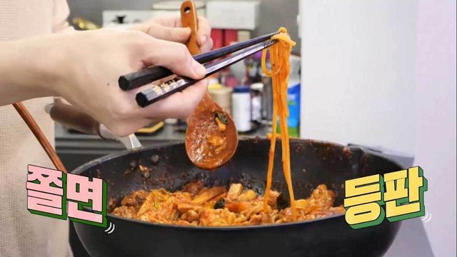 마지막으로 떡과 쫄면을 넣어 한소끔 볶는다. 깻잎과 홍고추로 장식해 주면 누구나 쉽게 만들 수 있는 '쫄면 닭갈비'가 완성된다.