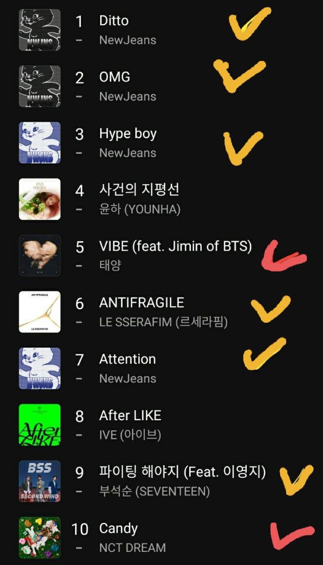 top10에 하이브에서 나온게 6개 (노란색 체크)