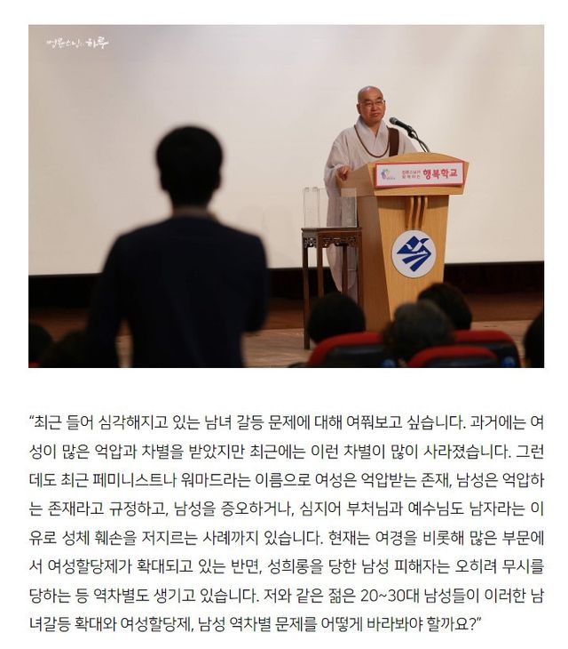 여성 평등의 요구가 높은 오늘날, 남자들은 과거 가부장의 폐해로 인한 빚을 갚는다는 자세로 고개를 숙이고 가만히 지낼 수밖에 없어요. 스님도 남자이기 때문에 이 피해를 고스란히 받을 수밖에 없어요.