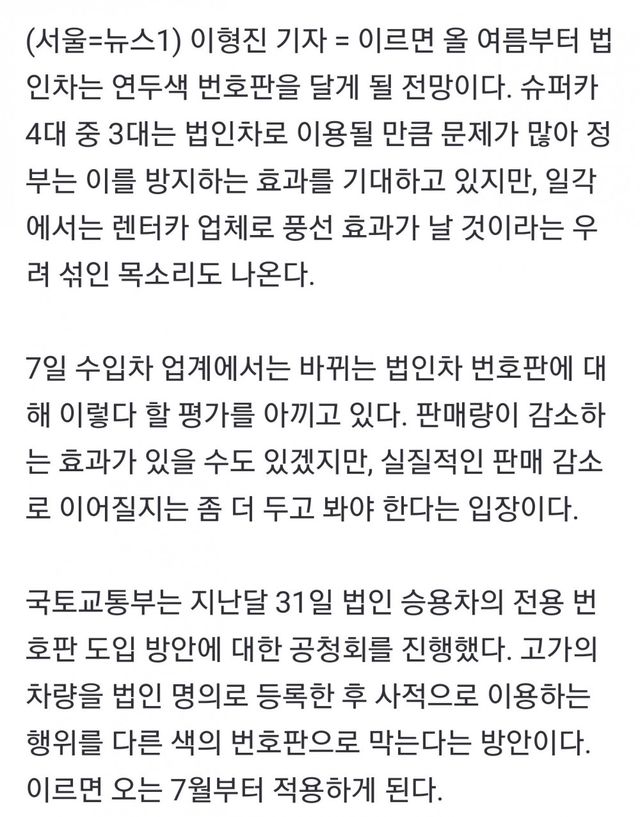 7월부터 법인스포츠카 번호판 색상 연두색으로 바뀐다