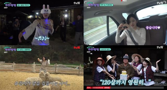 여행 둘째 날, 운전대에서 벗어난 안유진은 한층 여유로운 바이브로 여행을 즐겼다. 안유진은 직접 검색한 근처 맛집으로 멤버들을 안내했고, 폭우 속에 운전대를 잡은 이은지를 보며 “생각보다 좋다. 안정감이 든다”고 응원하며 초보 운전자로서 불안한 심경을 폭풍 공감했다. 식사 후에는 나영석 PD가 추천한 양떼 목장에서 아드레날린을 한껏 폭발시켰다. ‘양띠’임을 강조하며 양떼 목장에 입성한 안유진은 동물들과 교감하며 즐거운 시간을 보냈다.