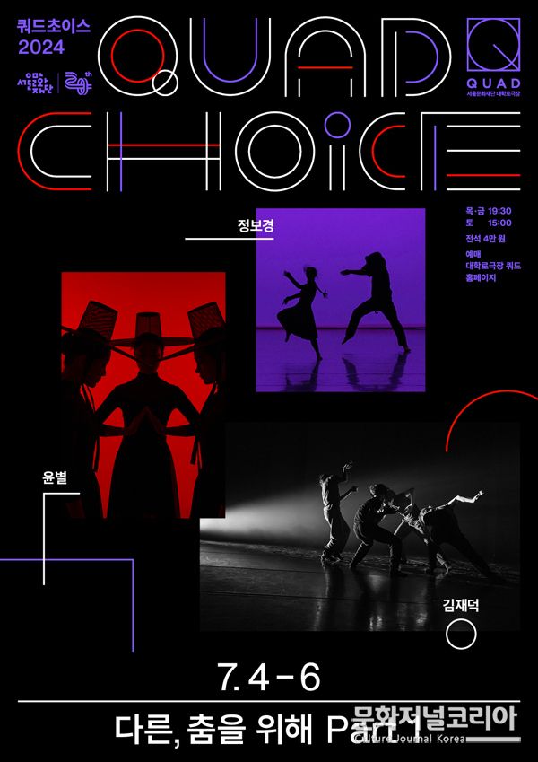 문화저널코리아 김영일 기자 | 서울문화재단(대표이사 이창기) 대학로극장 쿼드는 오는 7월 4일부터 13일까지 '다른, 춤을 위해' 공연을 ‘트리플 빌(Triple Bill)’ 방식으로 무대에 올린다.