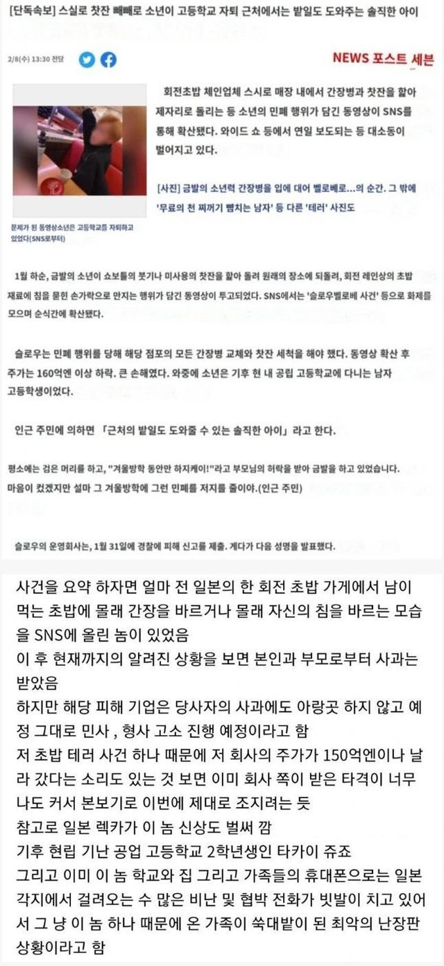 오피셜이 나와서 저 초밥 회사가 받은 엄청난 금전적인 피해를 생각을 해 본 다면 일본에서는 현재 그래서 그냥 다 이 놈의 업보이자 자업자득이라는 인식이 강하다고 함