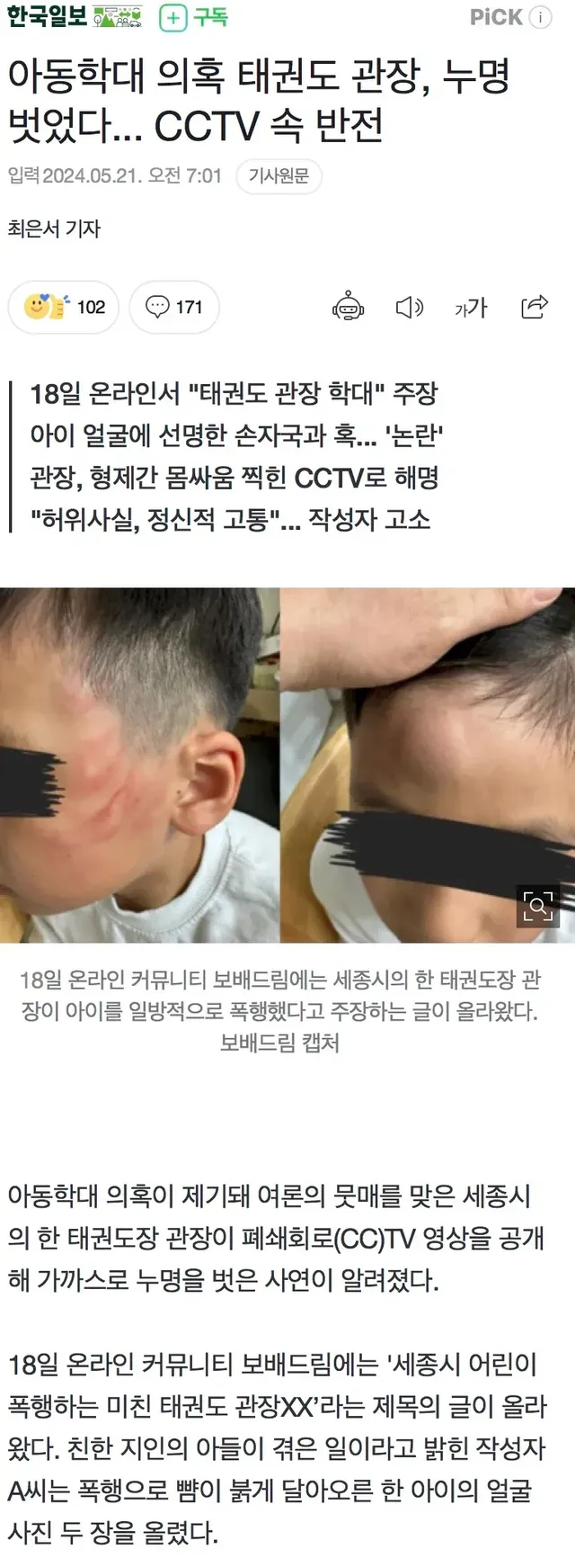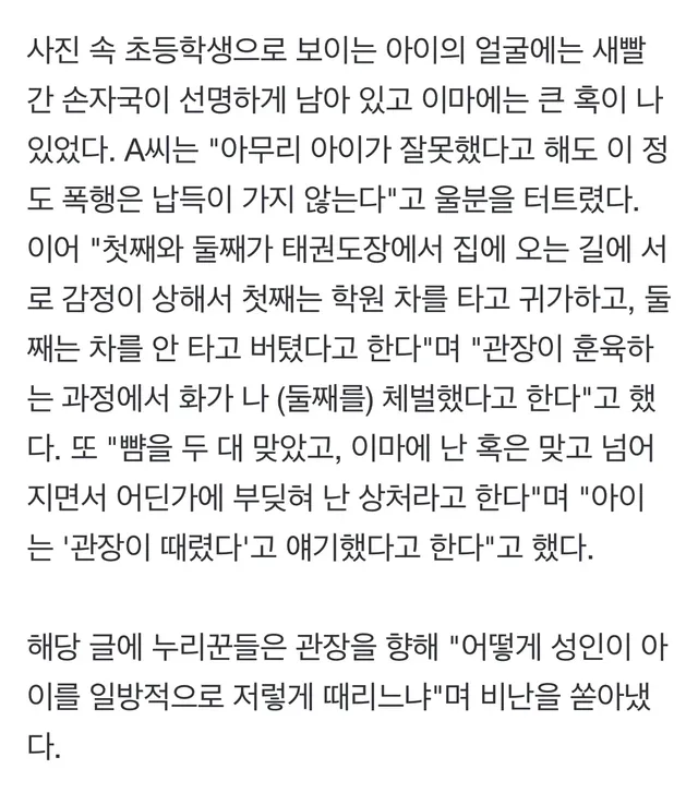 보배드림에 학부모 A씨가 태권도장에서 자녀가 관장한테 두들겨 맞고왔다고 게시글 올려서 공론화시킴