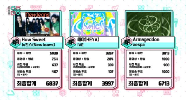 뉴진스는 8일 방송된 MBC ‘쇼! 음악중심’에서 신곡 ‘하우 스위트’로 아이브의 ‘해야’, 에스파의 ‘아마겟돈’을 제치고 1위 트로피를 들어올렸다. 뉴진스는 이날 방송에 출연하지 않았다.