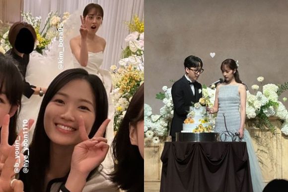 김보라는 결혼식 후 지인들이 축하하며 올린 결혼식 사진을 자신의 SNS에 공유해 눈길을 모았다. 그 게시물 중 눈길을 끈 이는 김혜윤이다. 김혜윤은 밝게 웃으며 브이 포즈를 취하고 있다.