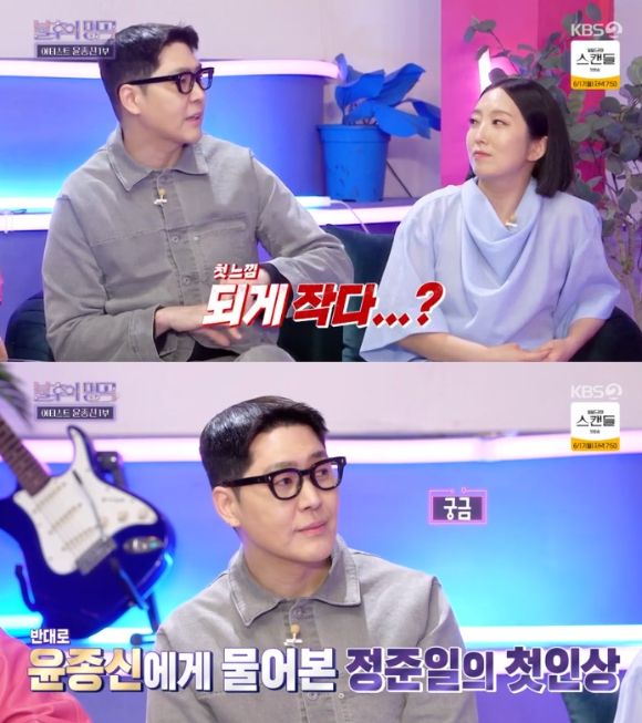또 그는 "앞에 형이 걸어오는데 첫 느낌은 '되게 작다'였다. 경외심이 들지는 않았다"라고 해 웃음을 자아냈다. 윤종신은 이런 정준일에 대해 "처음 만났을 때 너무 스키니한 바지를 입어서 압박 붕대를 하고 나온 줄 알았다"라고 했다. 정준일은 "피 통하냐고 묻더라. 서로 첫인상이 좋지는 않았다"라고 덧붙였다.