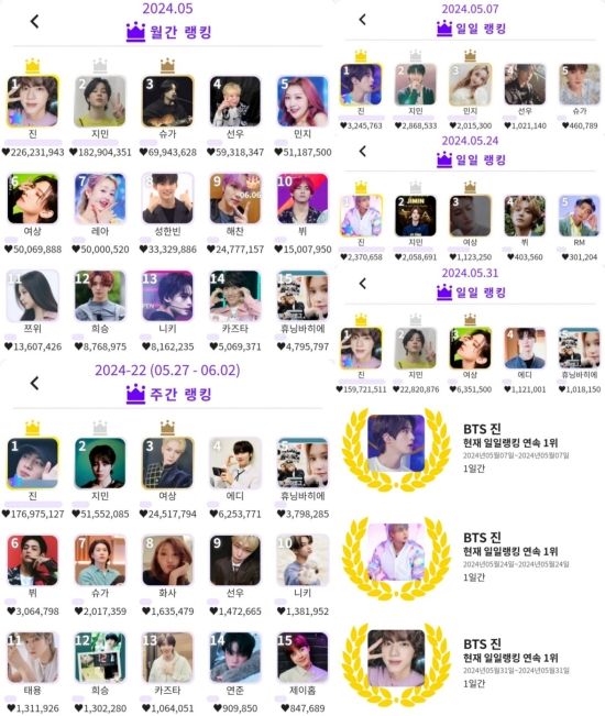 이뿐만 아니라 진은 5월 5주 차(5월 27일~6월 2일)에 1억 7,697만 5,127개의 하트 수를 기록하며 주간랭킹 1위에 올랐다.